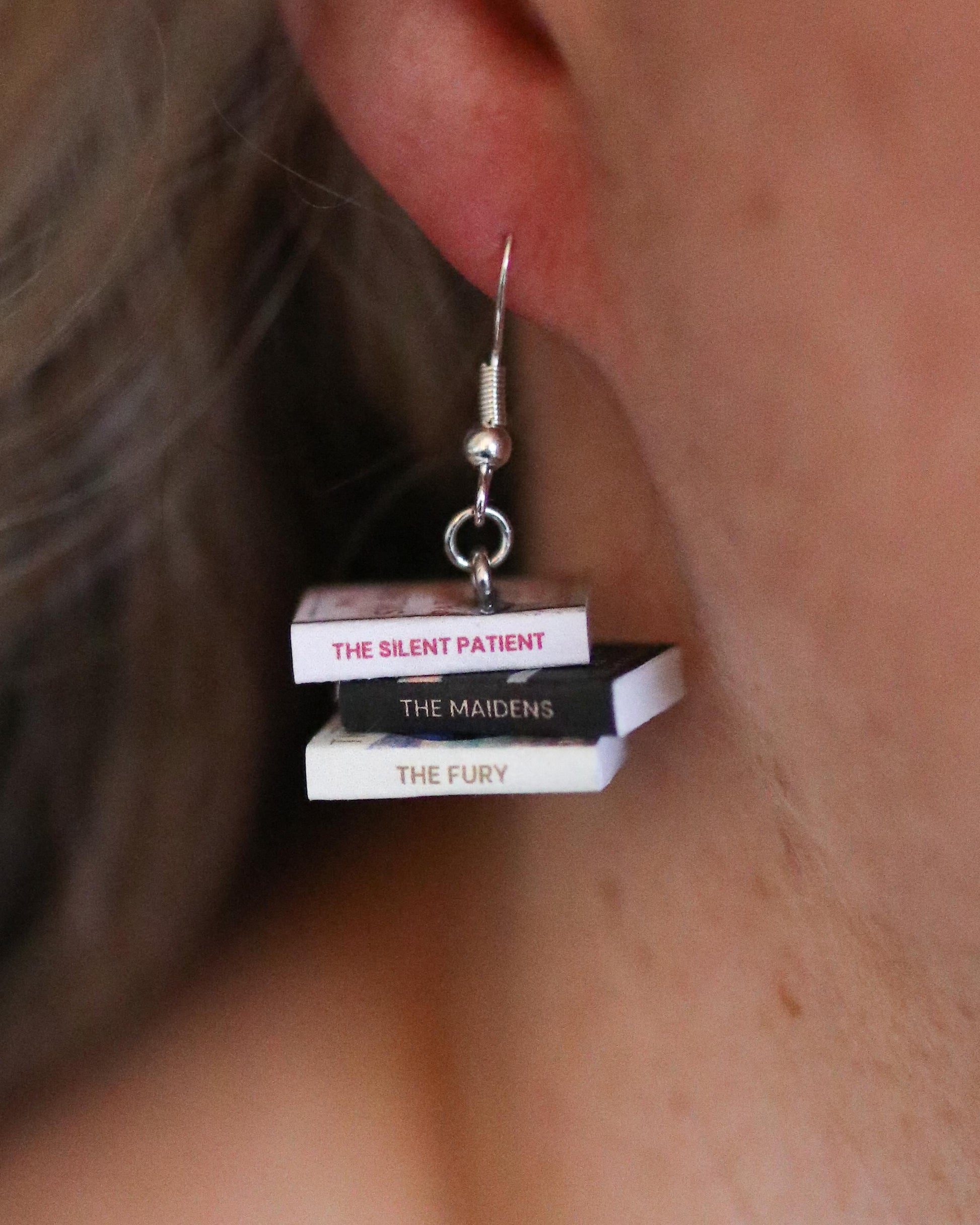 Each pair includes all of the books from the series, securely glued together in a cute stack to create realistic tiny towers of stories. Two matching stacks are carefully handcrafted by me to form a complete pair of earrings.