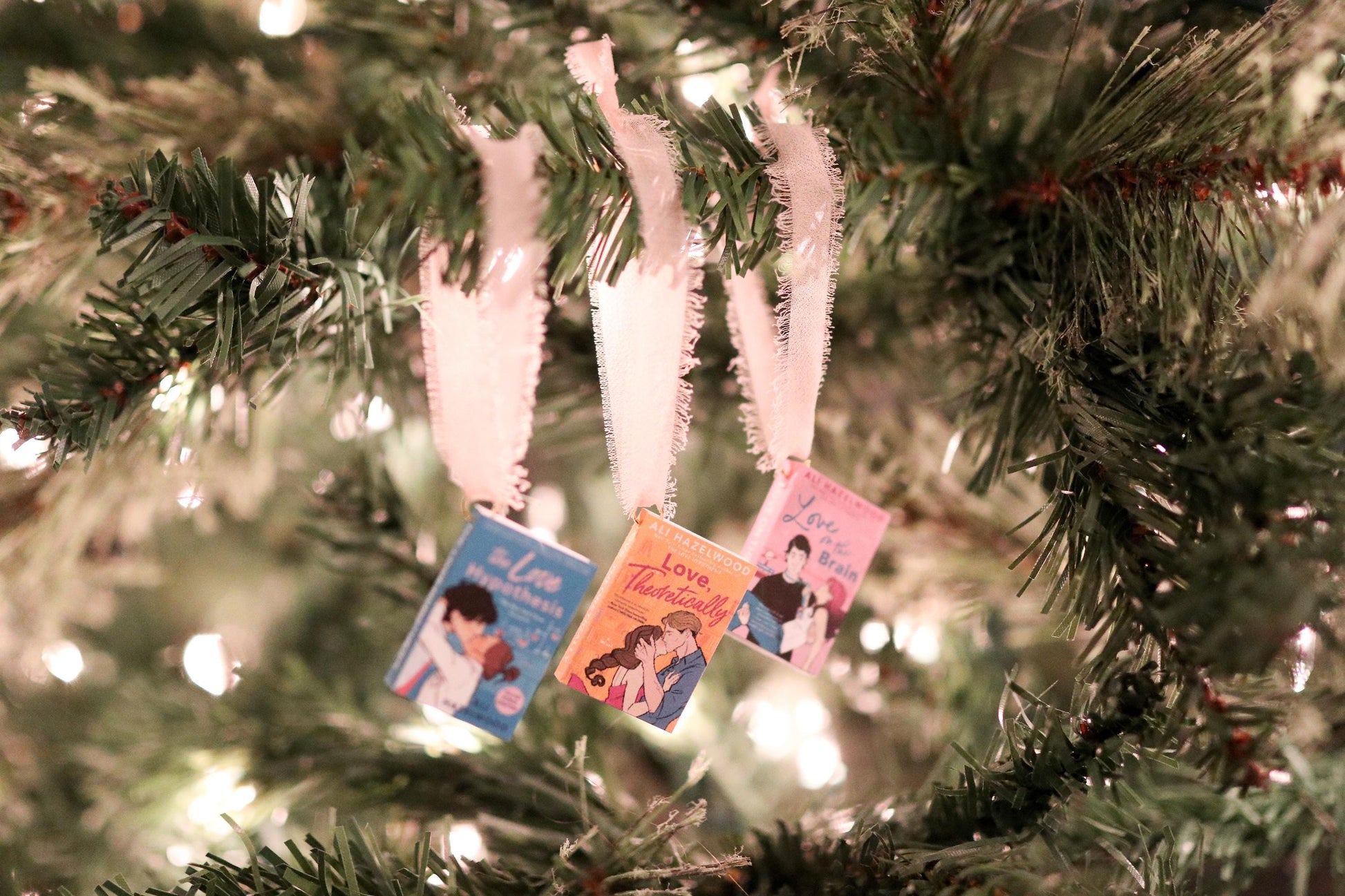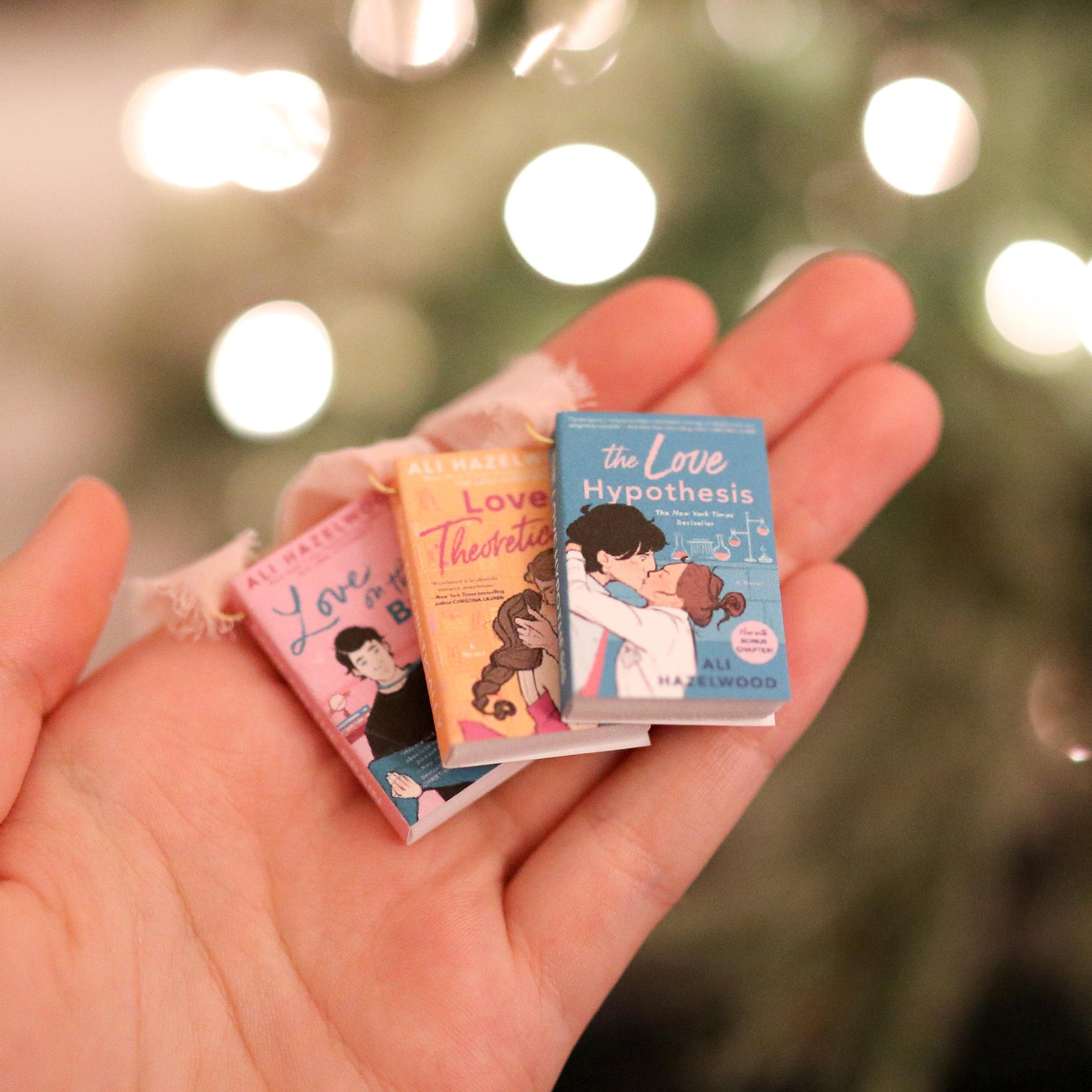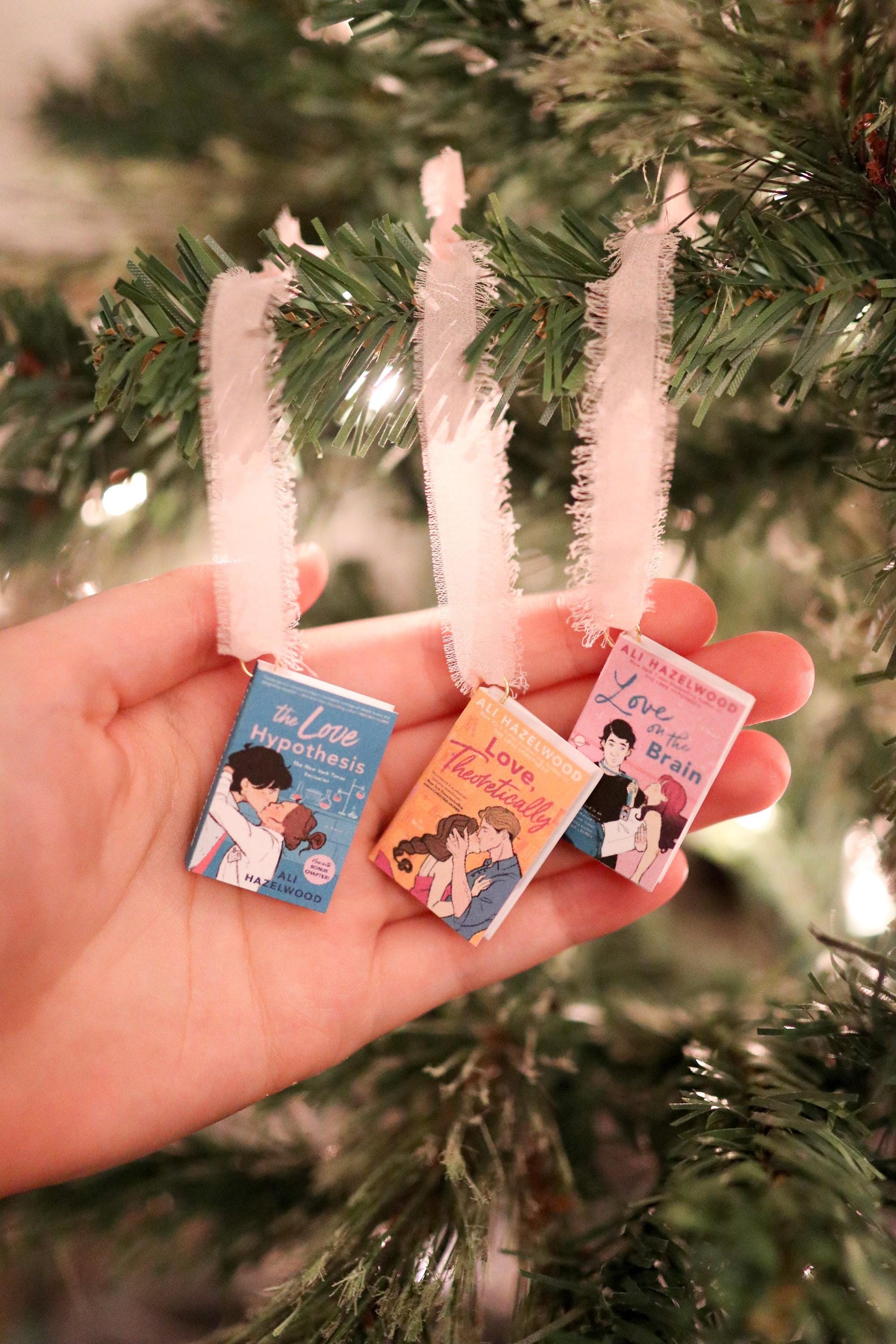 A handmade set of Ali Hazelwood inspired mini book ornaments!