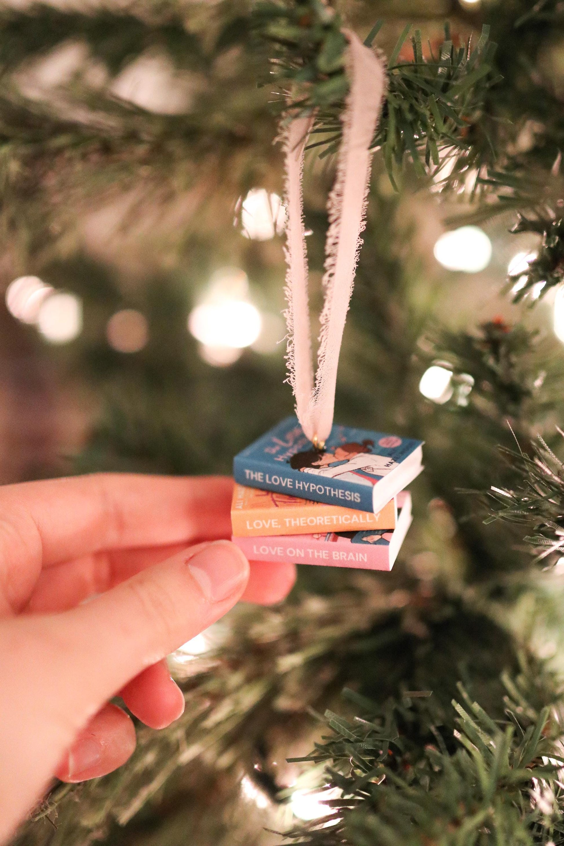 A handmade stacked mini book ornament inspired by the Ali Hazelwood series!