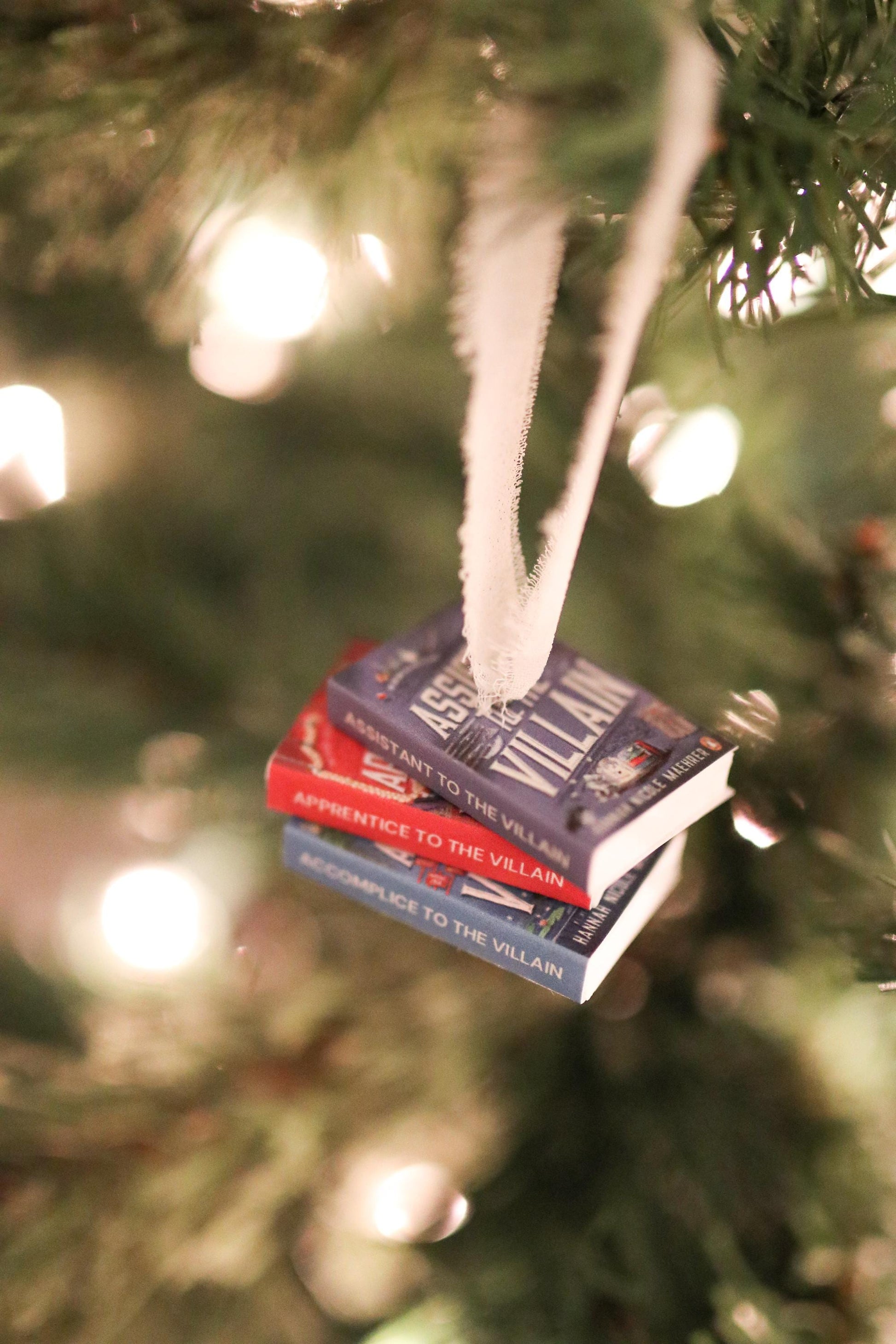 A handmade stacked mini book ornament inspired by the Assistant to the Villain series!