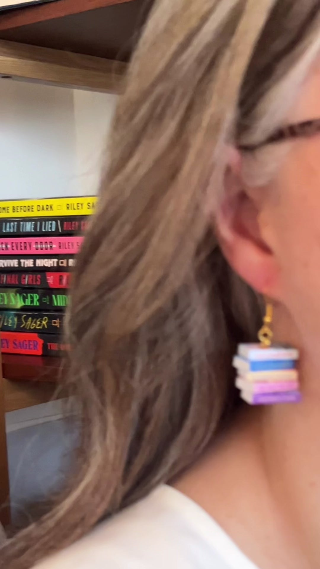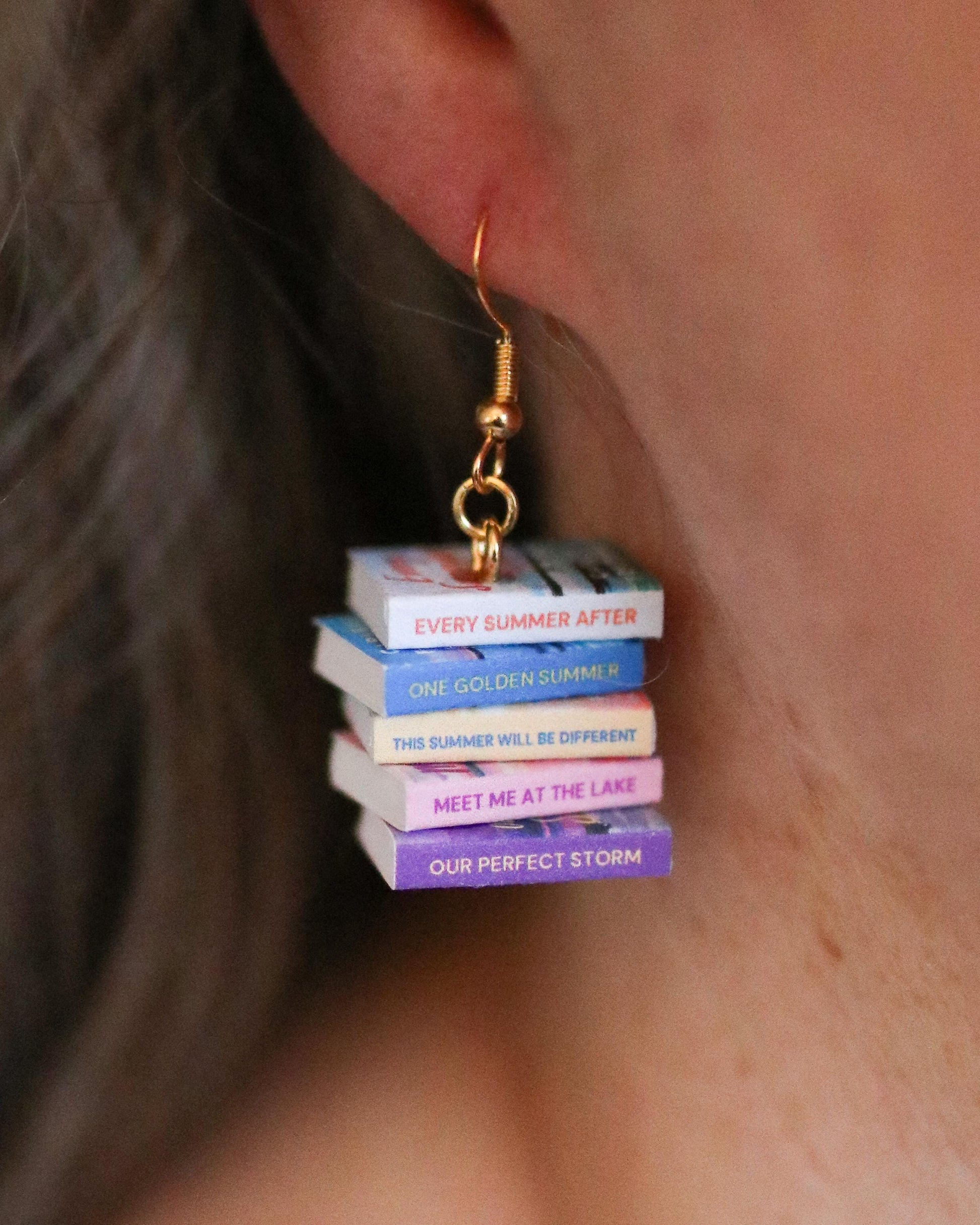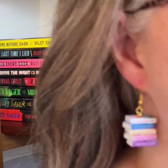 This pair of handmade earrings features an entire book series turned into two miniature book stacks (one book stack earring for each ear) creating a unique and cozy accessory perfect for book lovers, readers, librarians, book club gifts, author events, or everyday bookish style!