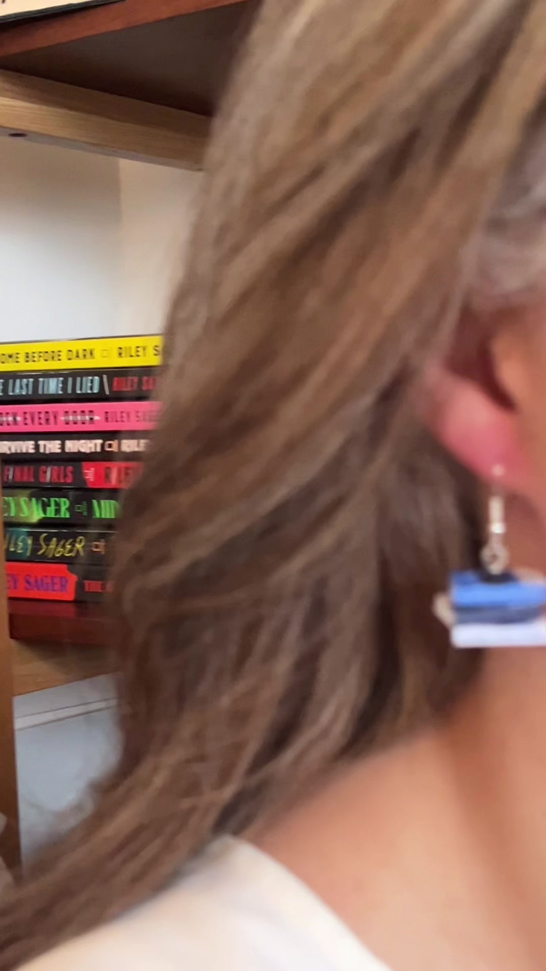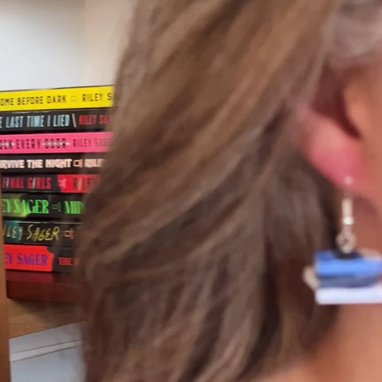 This pair of handmade earrings features an entire book series turned into two miniature book stacks (one book stack earring for each ear) creating a unique and cozy accessory perfect for book lovers, readers, librarians, book club gifts, author events, or everyday bookish style!