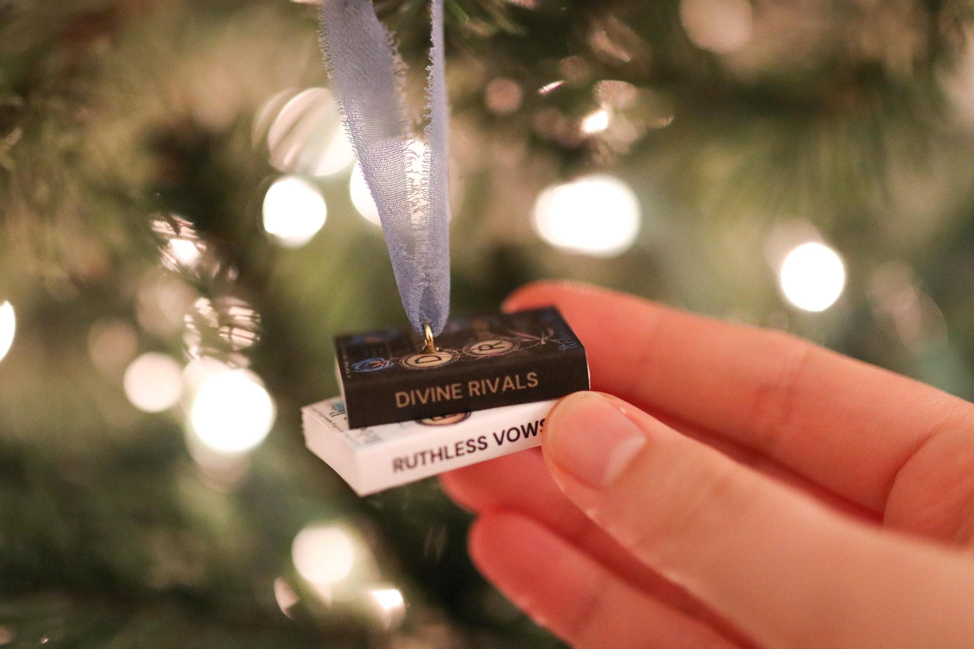 A handmade stacked mini book ornament inspired by the Divine Rivals series!