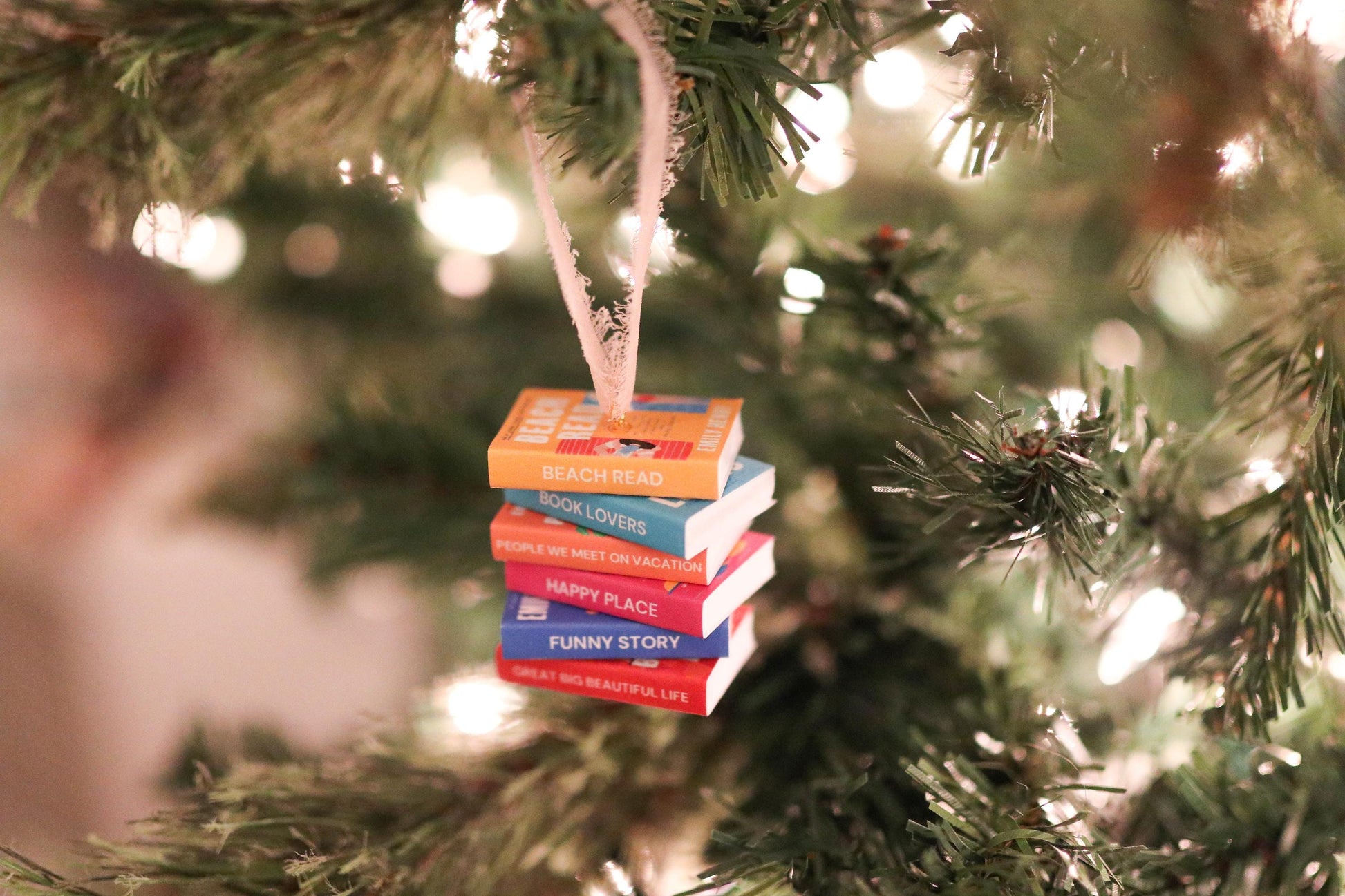 A handmade stacked mini book ornament inspired by Emily Henry books.