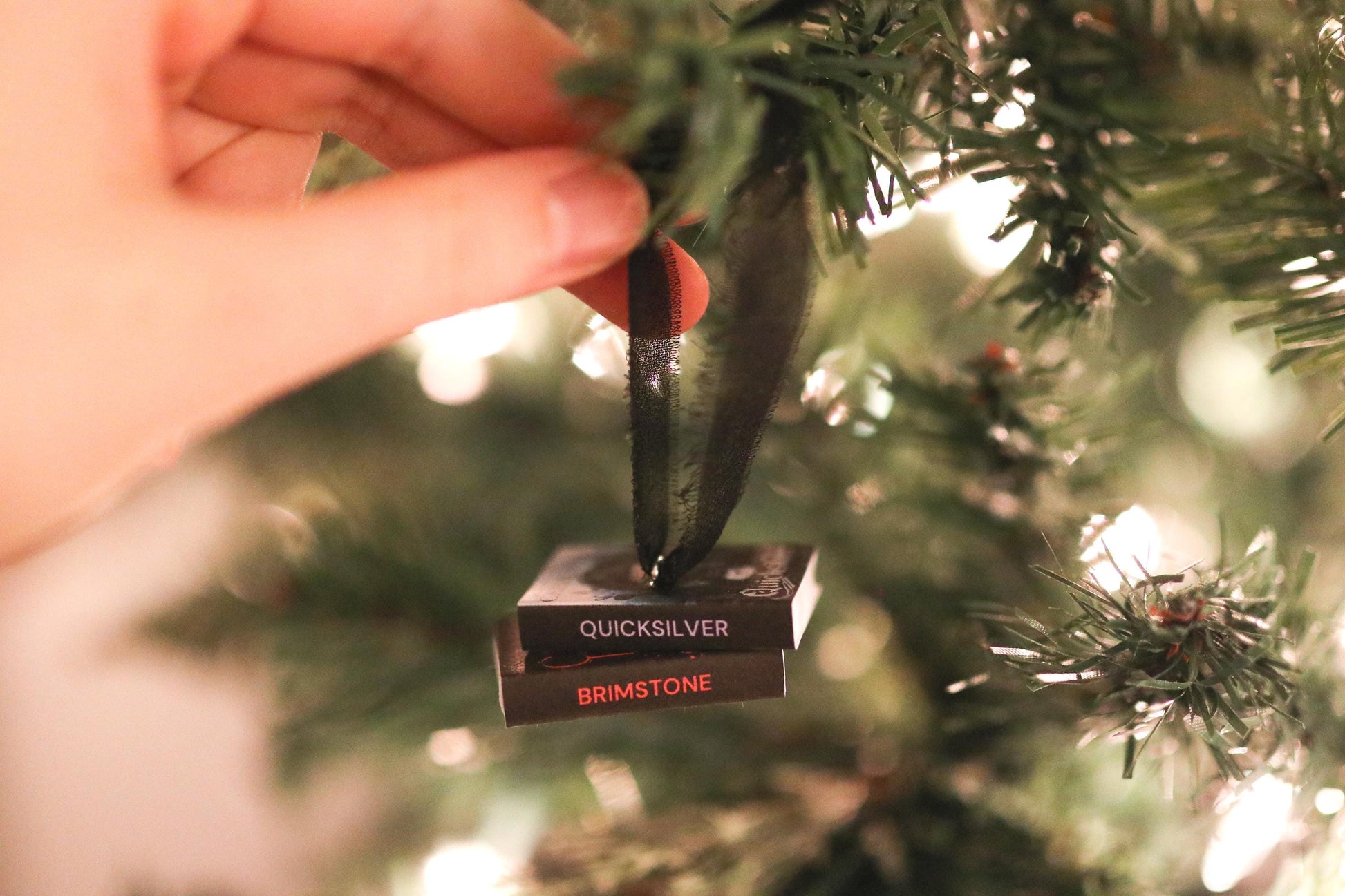 Each ornament includes all of the books from the series, securely glued together in a neat stack to create a realistic mini tower of stories. A small hook is carefully glued to the top of the stack and finished with a high-quality chiffon ribbon tied by hand, ready to hang on your Christmas tree or any display. Each miniature book is printed on matte cardstock and carefully adhered to foam board for sturdiness and dimension.