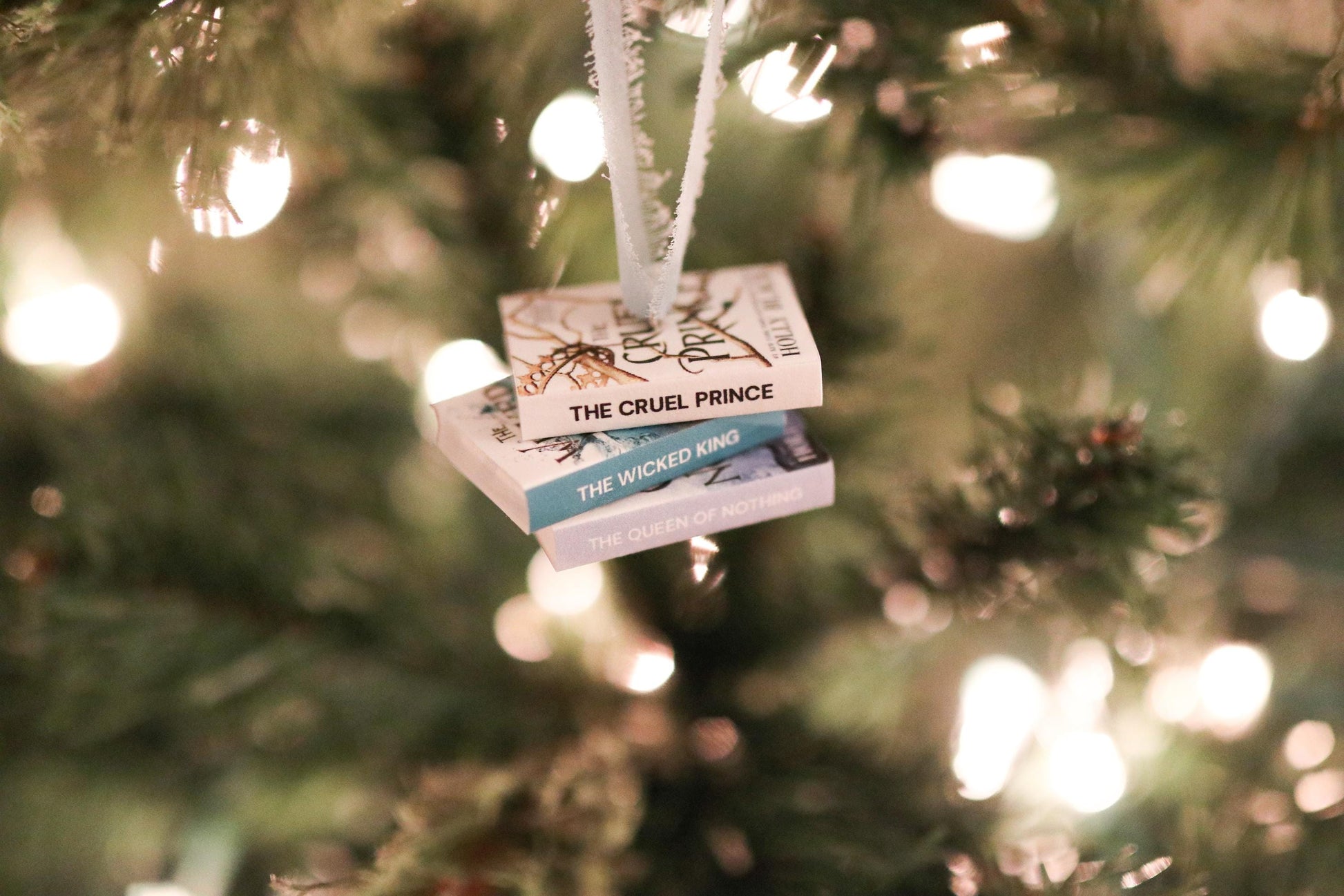 Each ornament includes all of the books from the series, securely glued together in a neat stack to create a realistic mini tower of stories. A small hook is carefully glued to the top of the stack and finished with a high-quality chiffon ribbon tied by hand, ready to hang on your Christmas tree or any display. Each miniature book is printed on matte cardstock and carefully adhered to foam board for sturdiness and dimension.