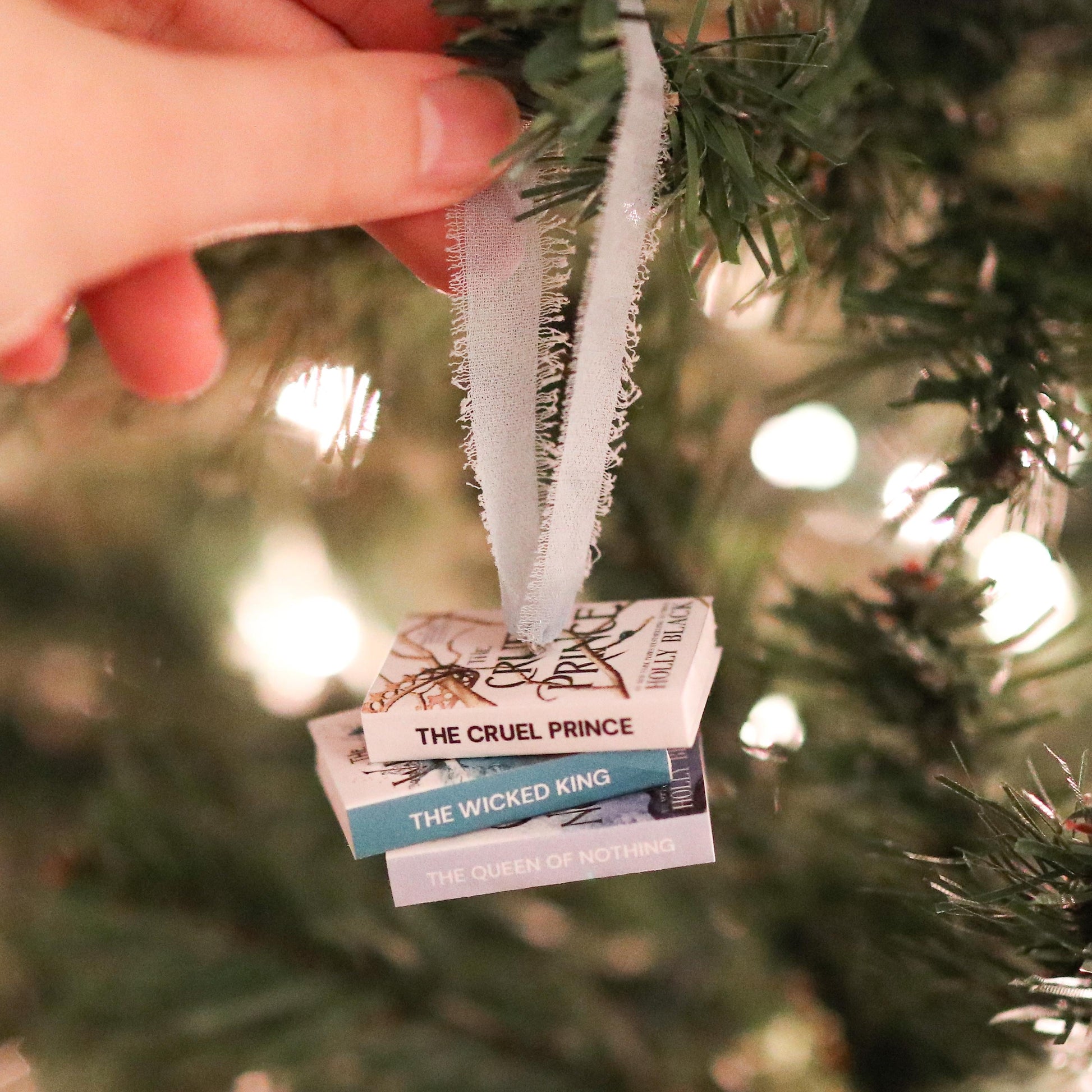 This ornament features an entire book series turned into one miniature book stack, perfect for book-themed Christmas trees, cozy reading nook decor, gift wrapping embellishments, or as a thoughtful gift for any book lover.