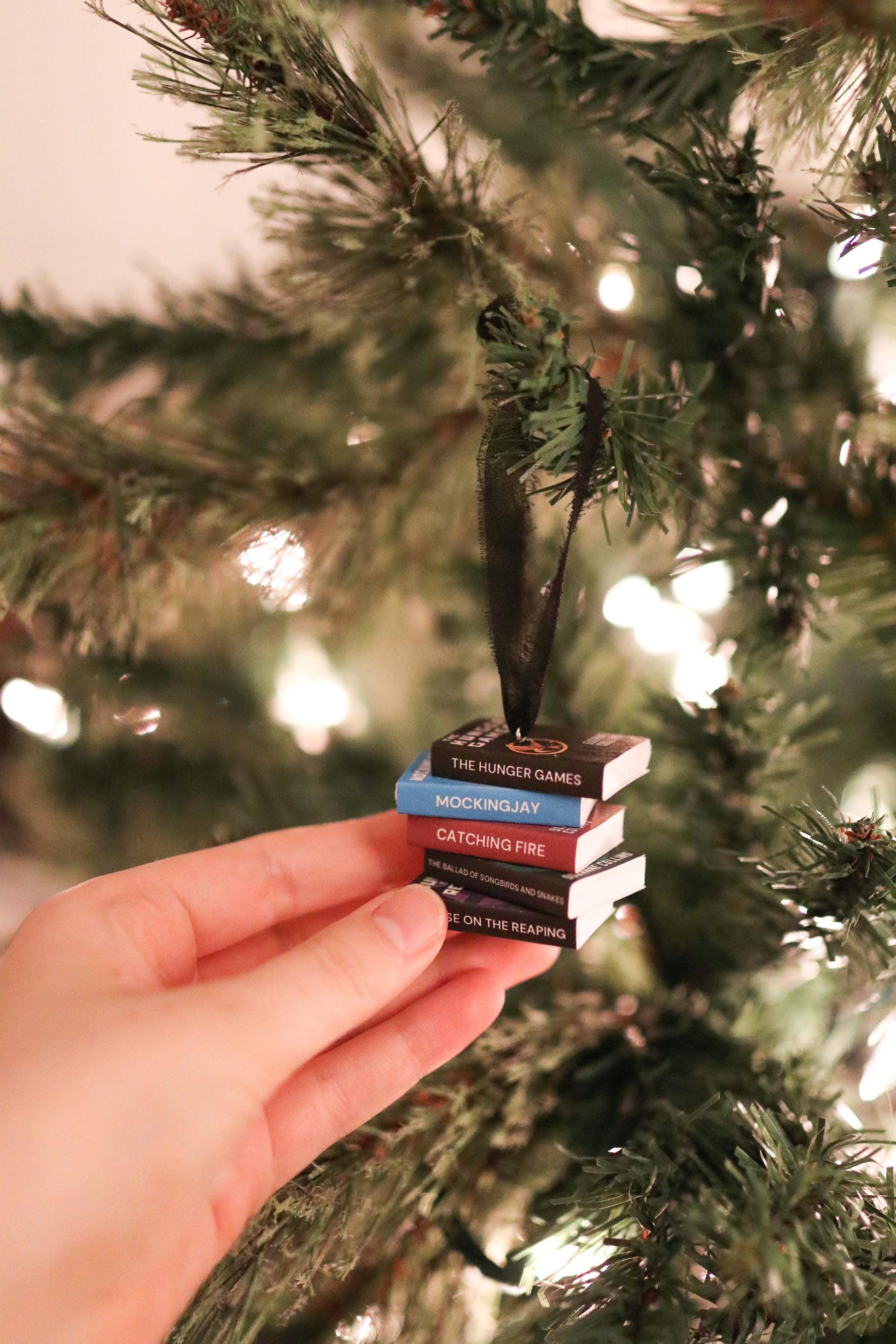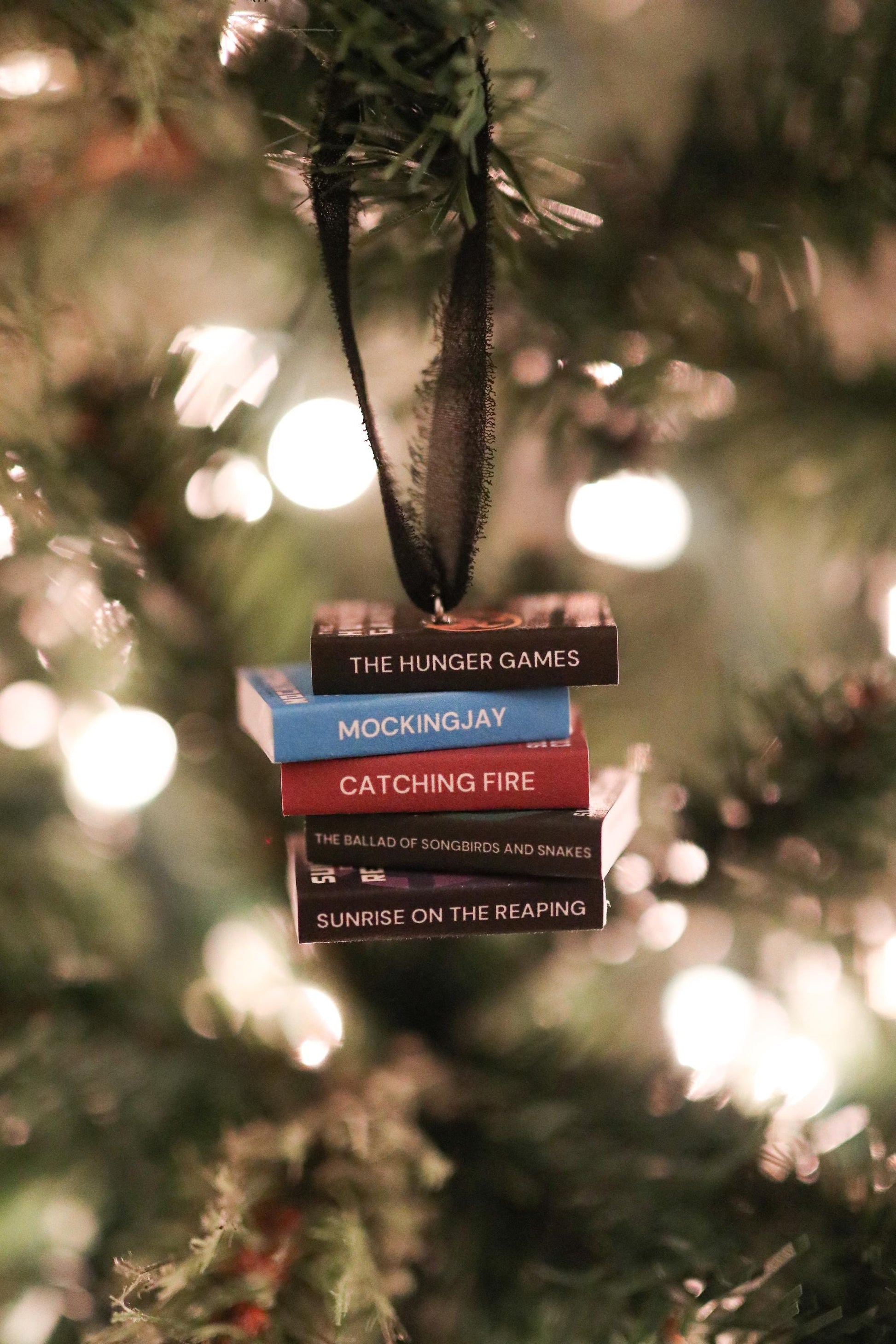 A handmade stacked mini book ornament inspired by the Hunger Games series!
