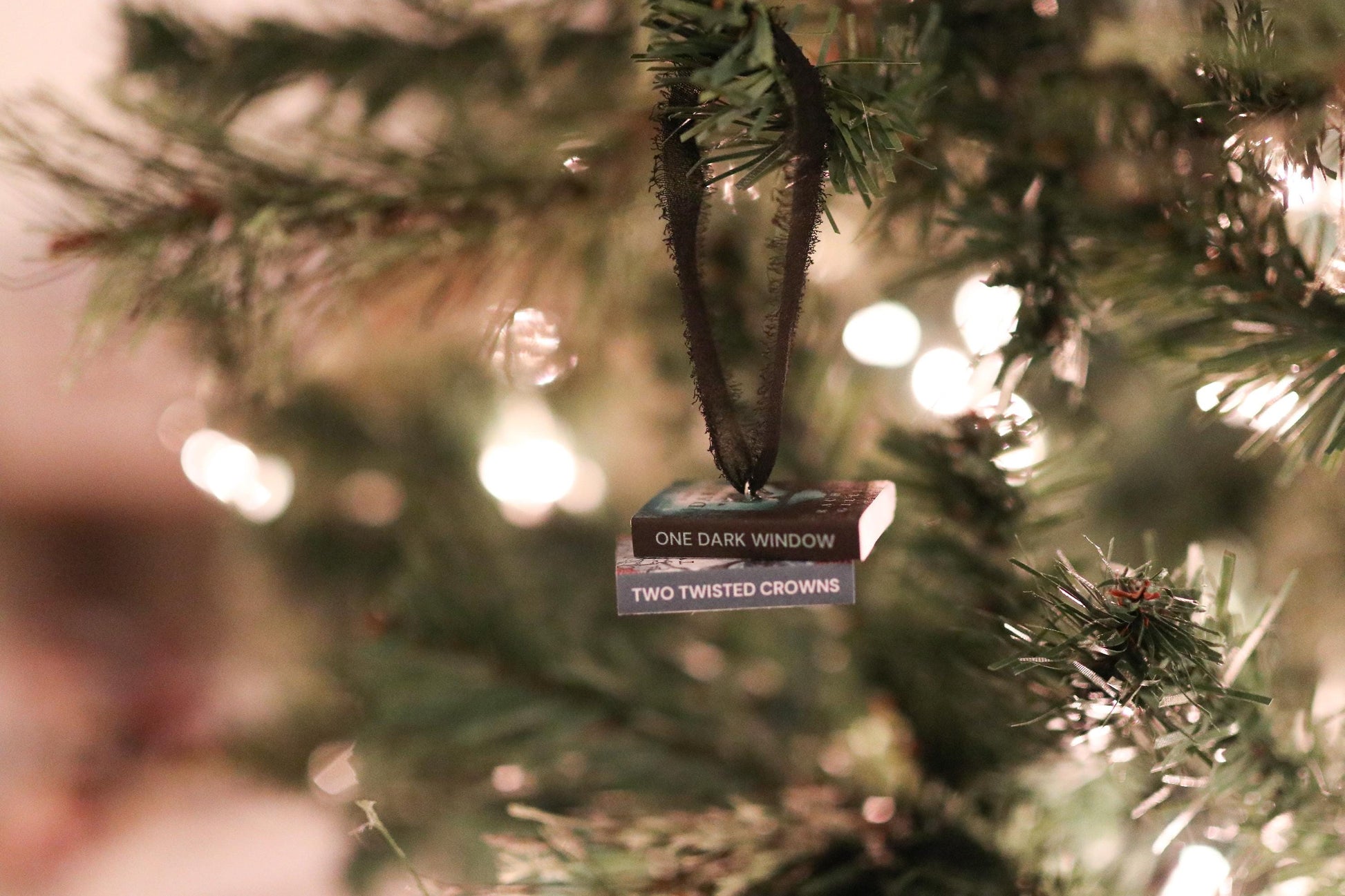 Each ornament includes all of the books from the series, securely glued together in a neat stack to create a realistic mini tower of stories. A small hook is carefully glued to the top of the stack and finished with a high-quality chiffon ribbon tied by hand, ready to hang on your Christmas tree or any display. Each miniature book is printed on matte cardstock and carefully adhered to foam board for sturdiness and dimension.