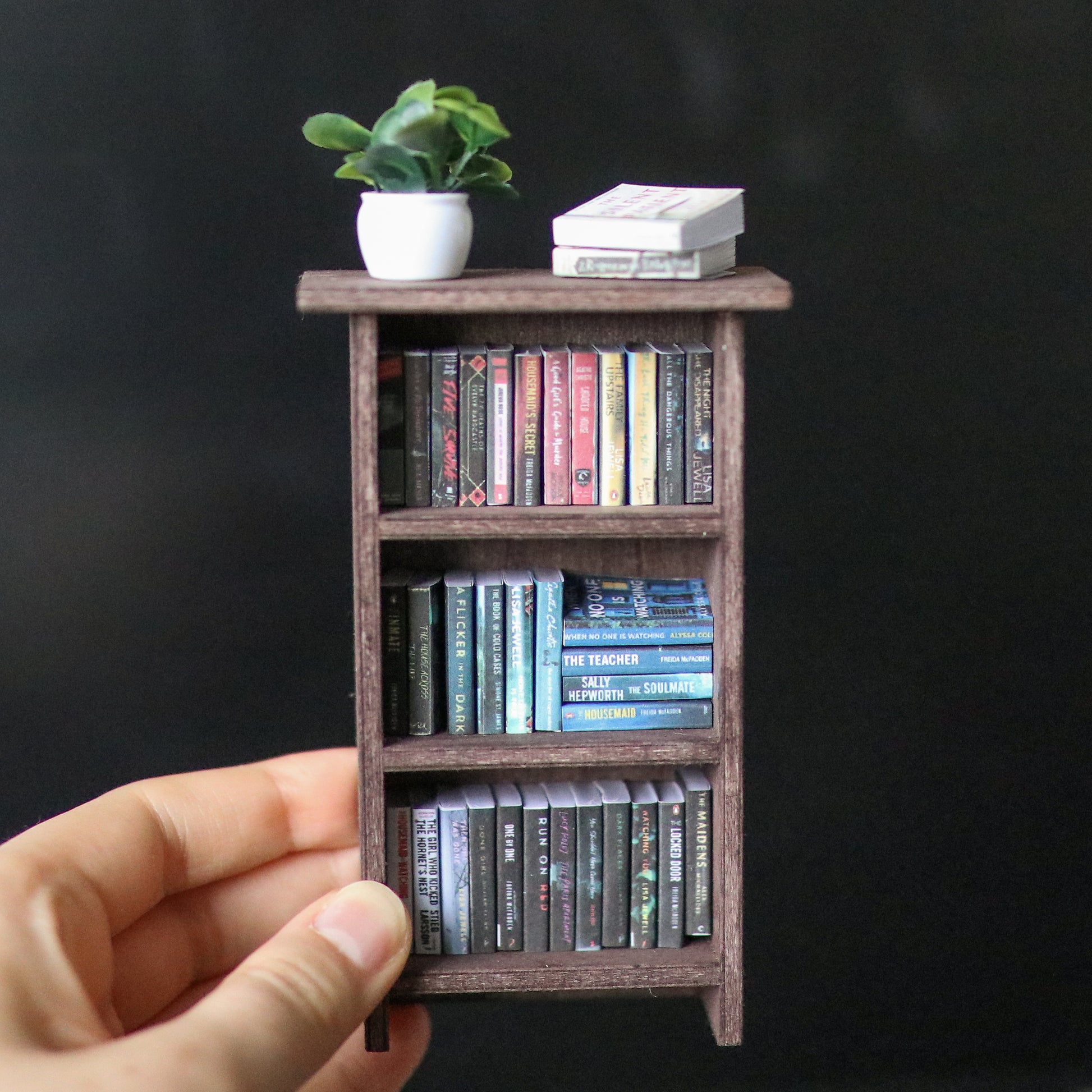 - A handmade, dark-stained wooden mini bookshelf (Choose between our STANDARD Bookcase - 4.44" tall x 2.6" wide x 1.36" deep OR our DELUXE Bookcase -4.99" tall x 2.59" wide x 1.04" deep)