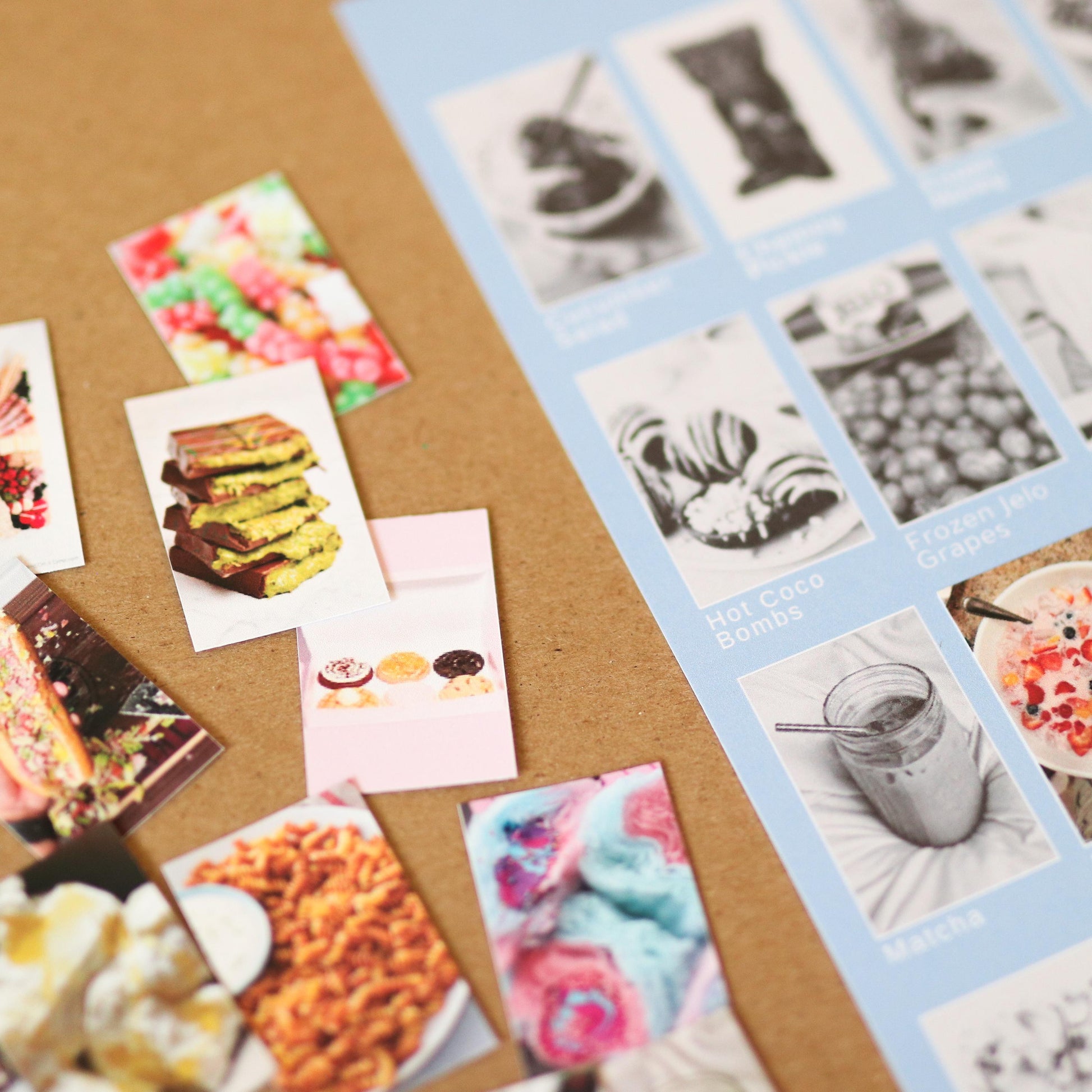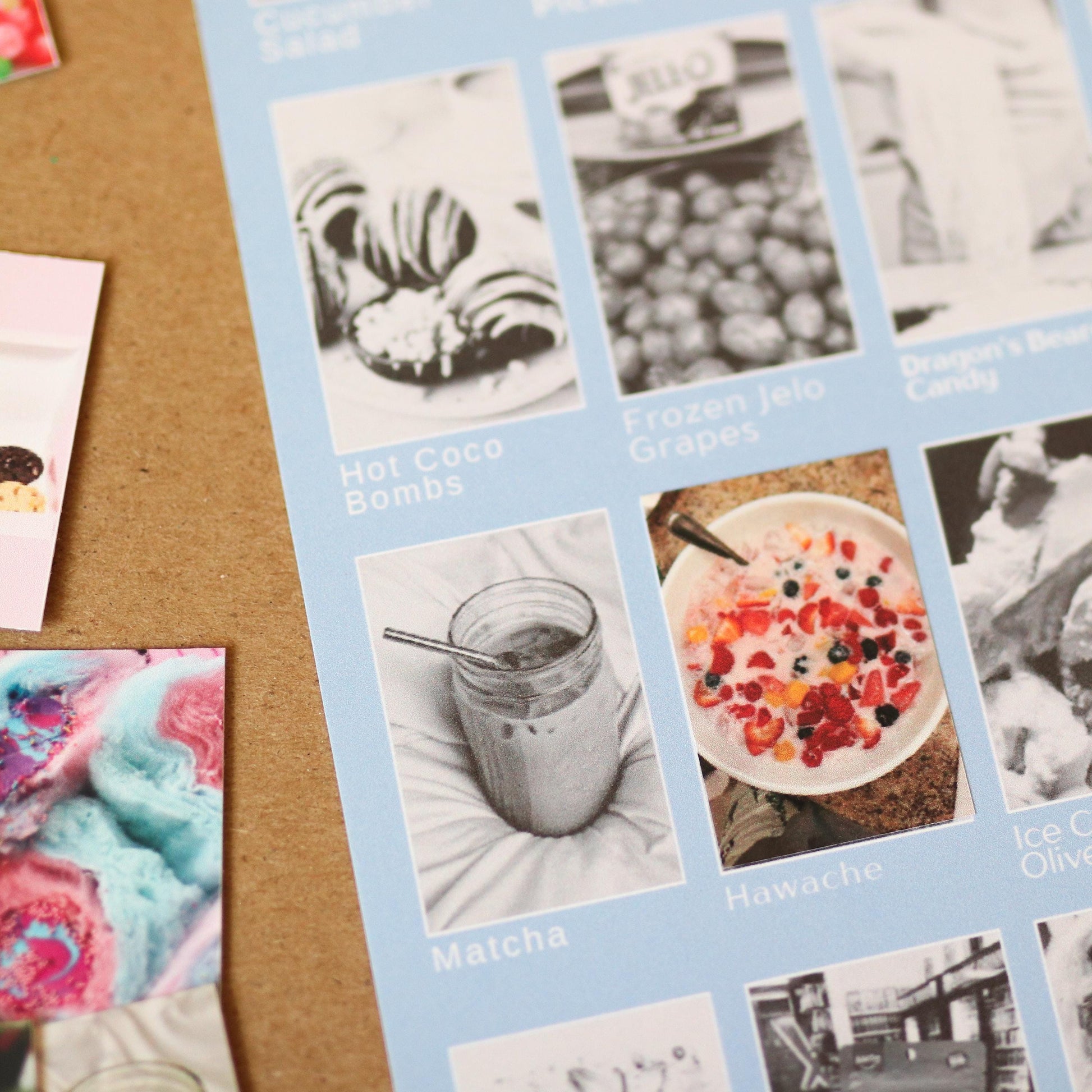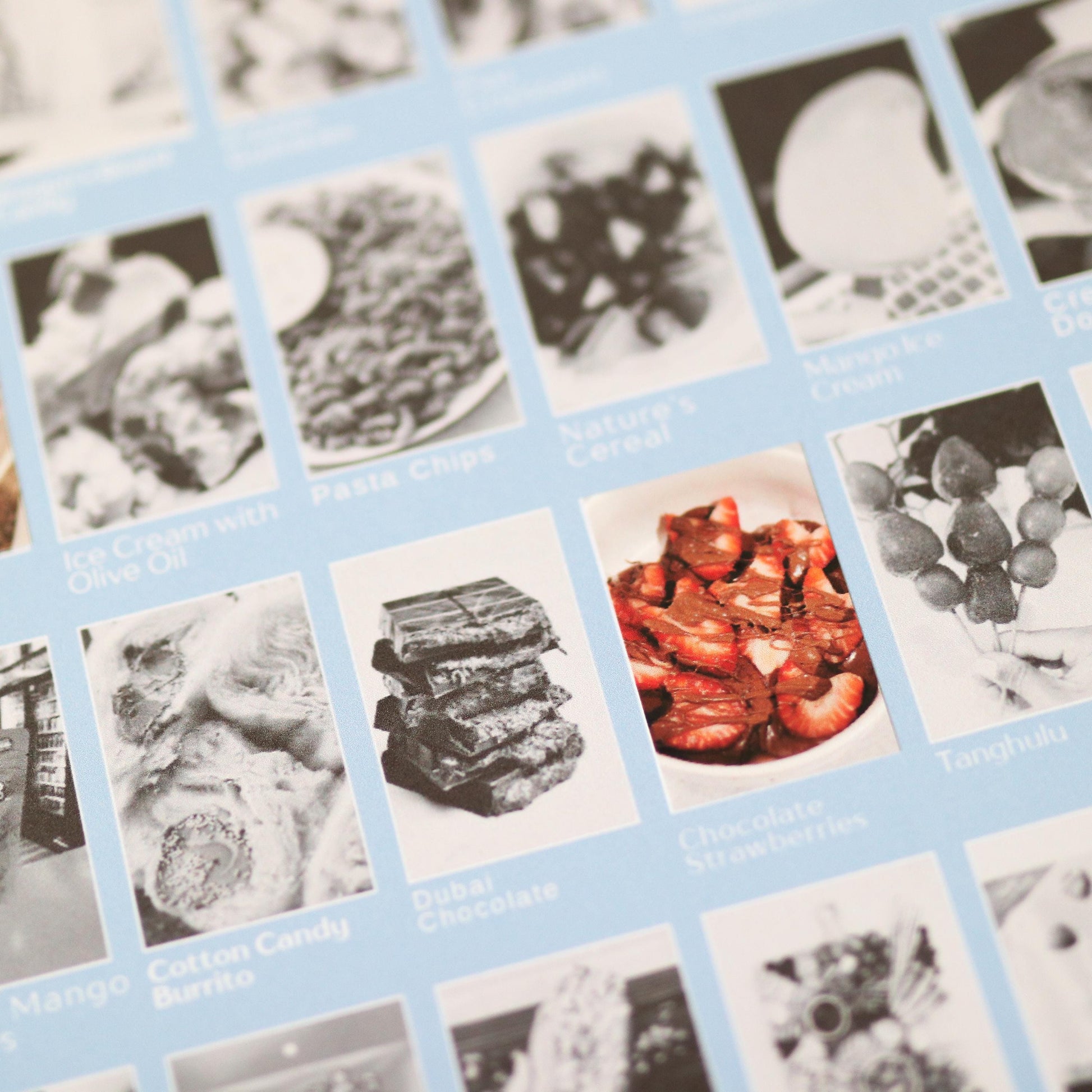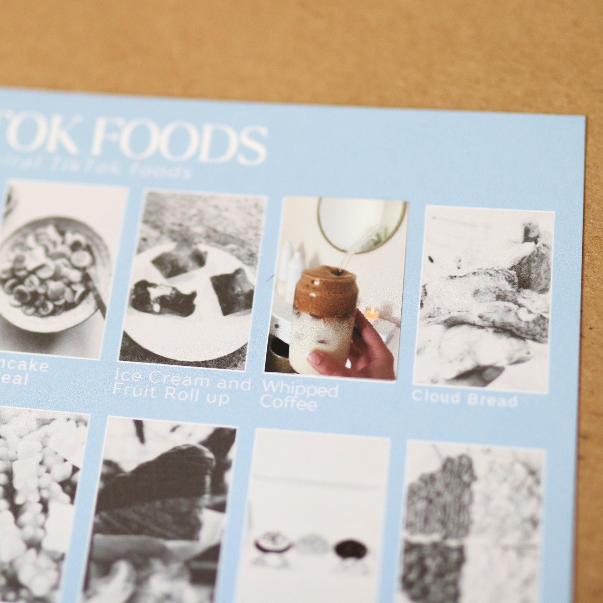 1) Display your 8" x 10" poster featuring black-and-white images of trending foods.