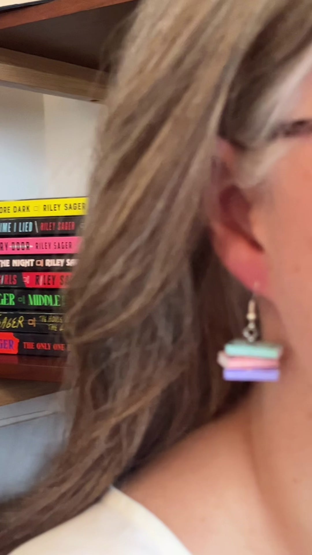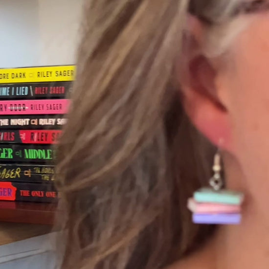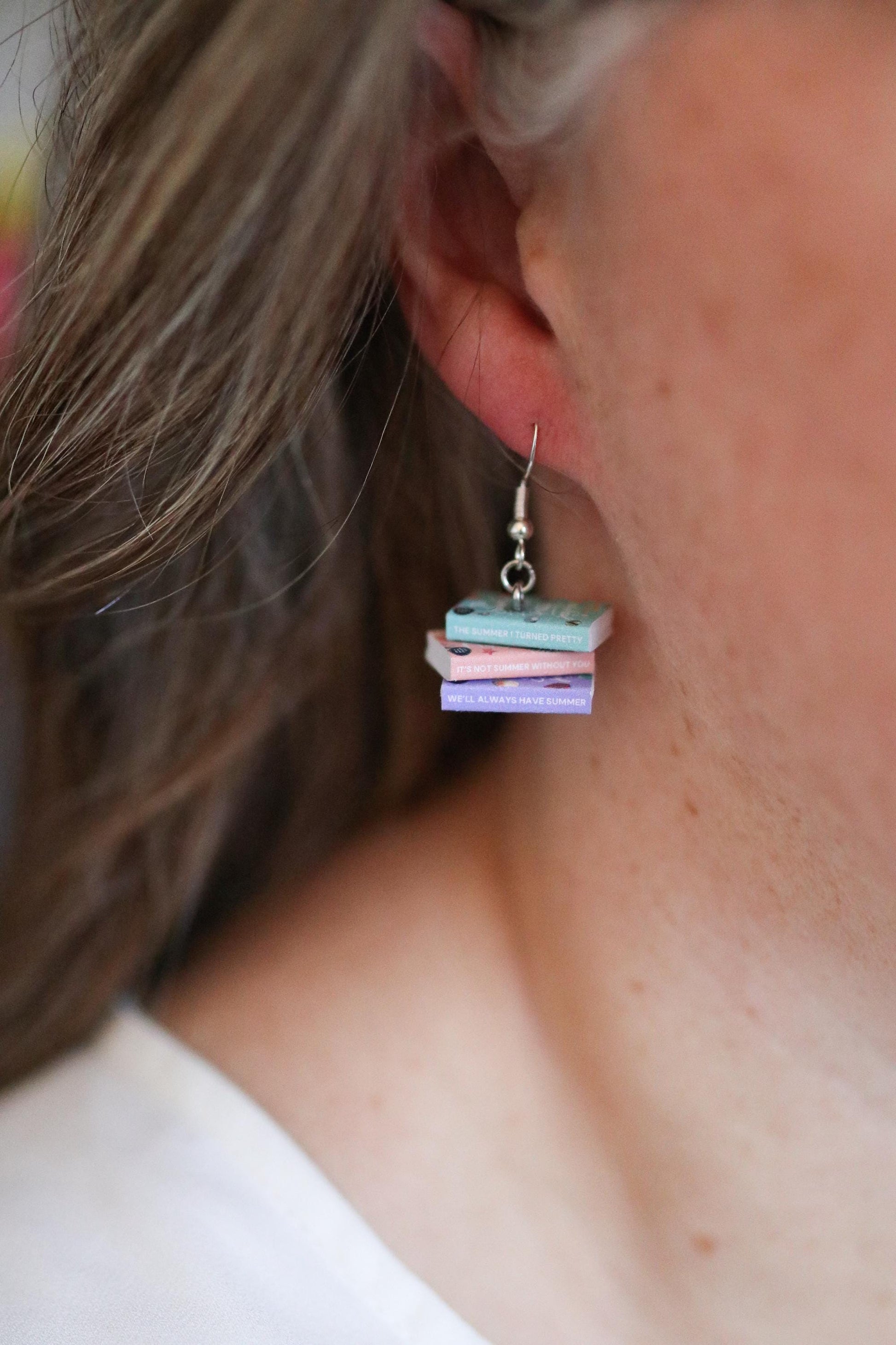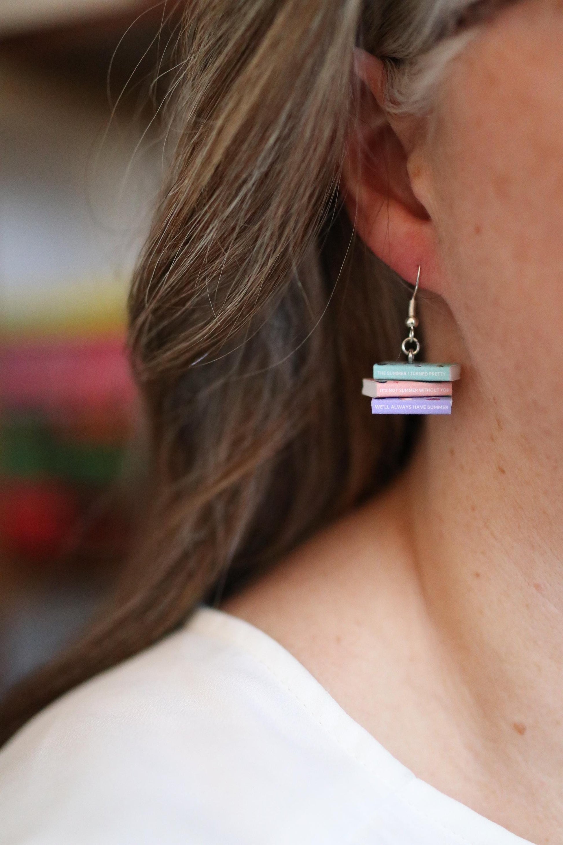 This pair of handmade earrings features an entire book series turned into two miniature book stacks (one book stack earring for each ear) creating a unique and cozy accessory perfect for book lovers, readers, librarians, book club gifts, author events, or everyday bookish style!