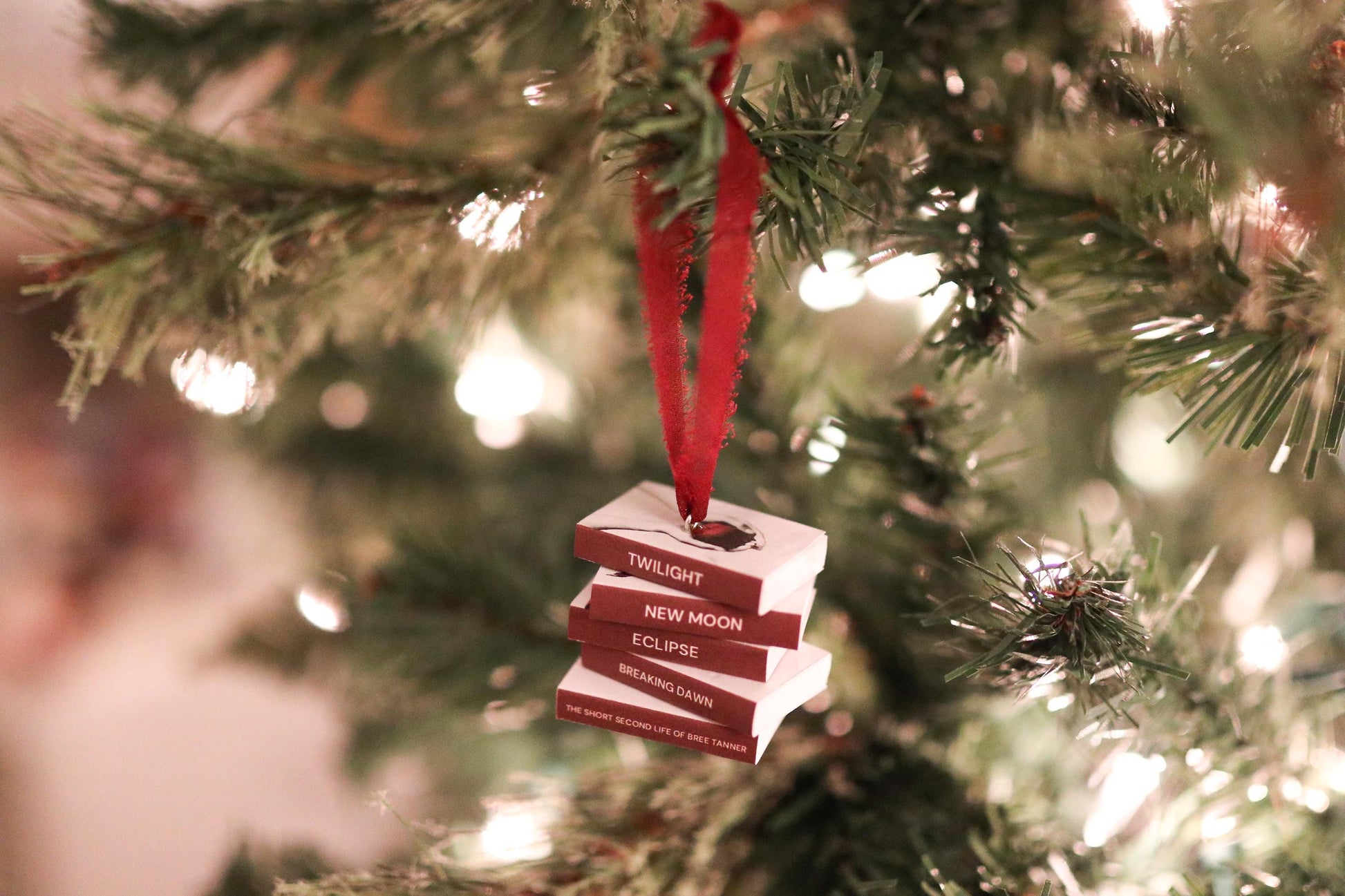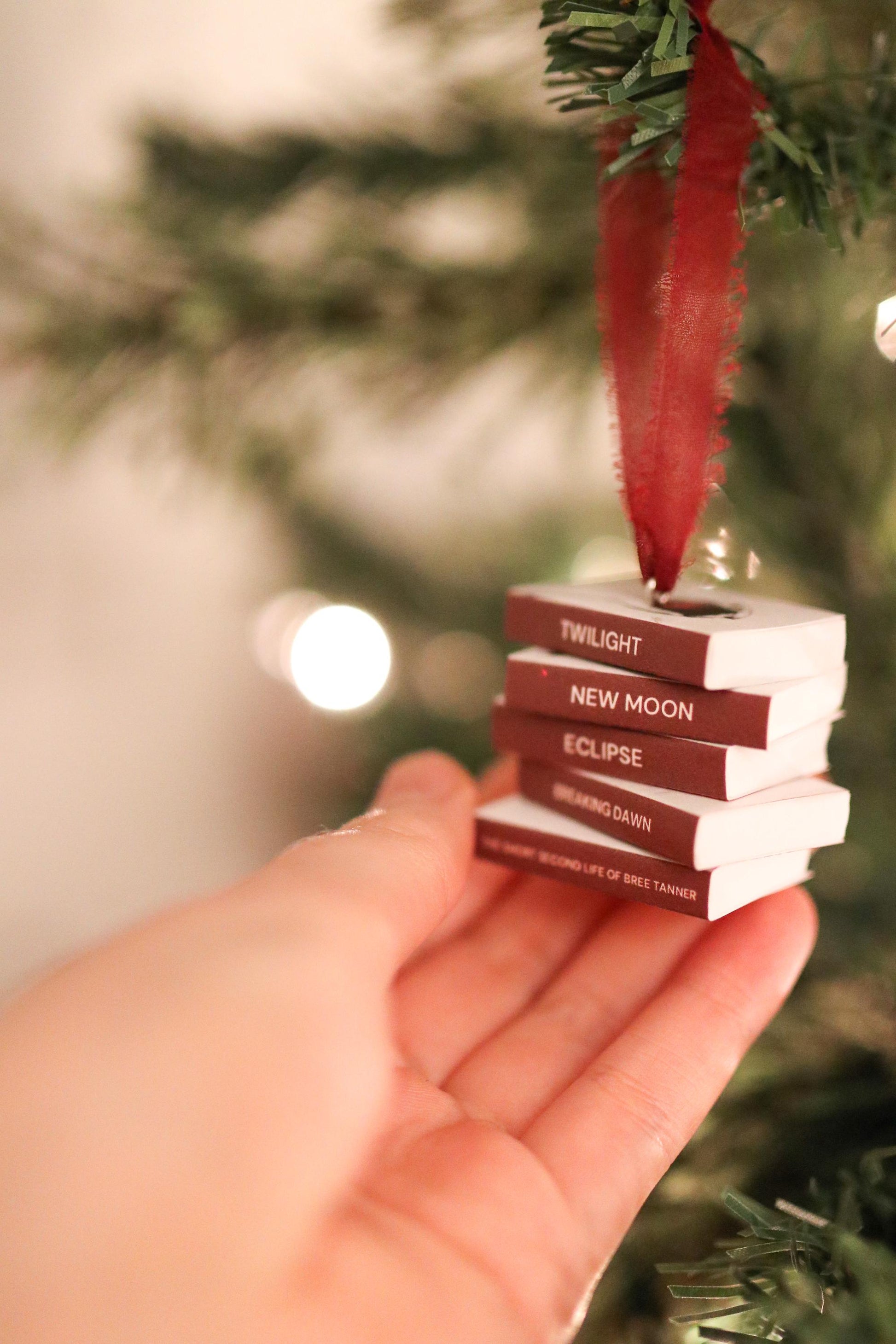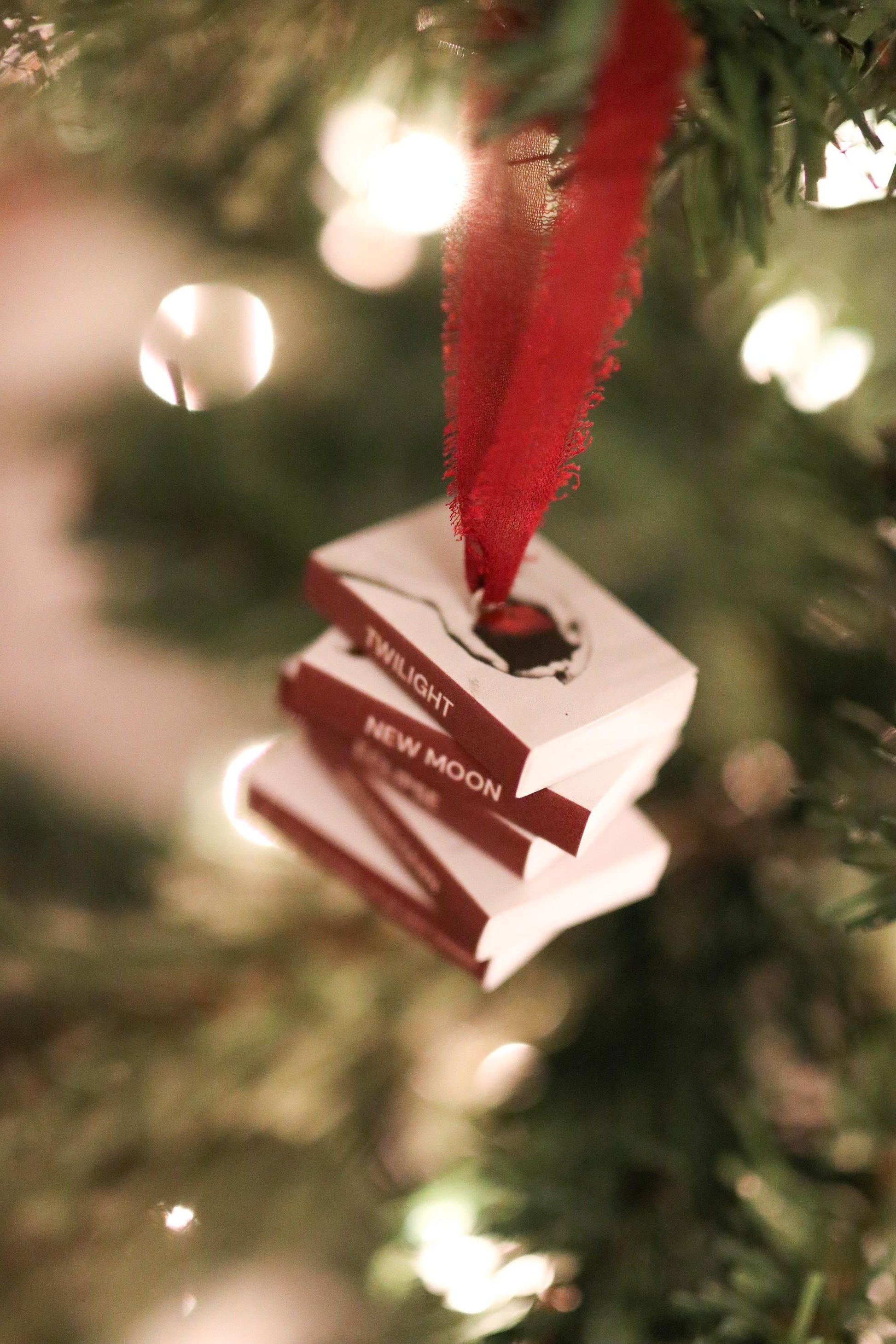 A handmade stacked mini book ornament inspired by the Twilight series.