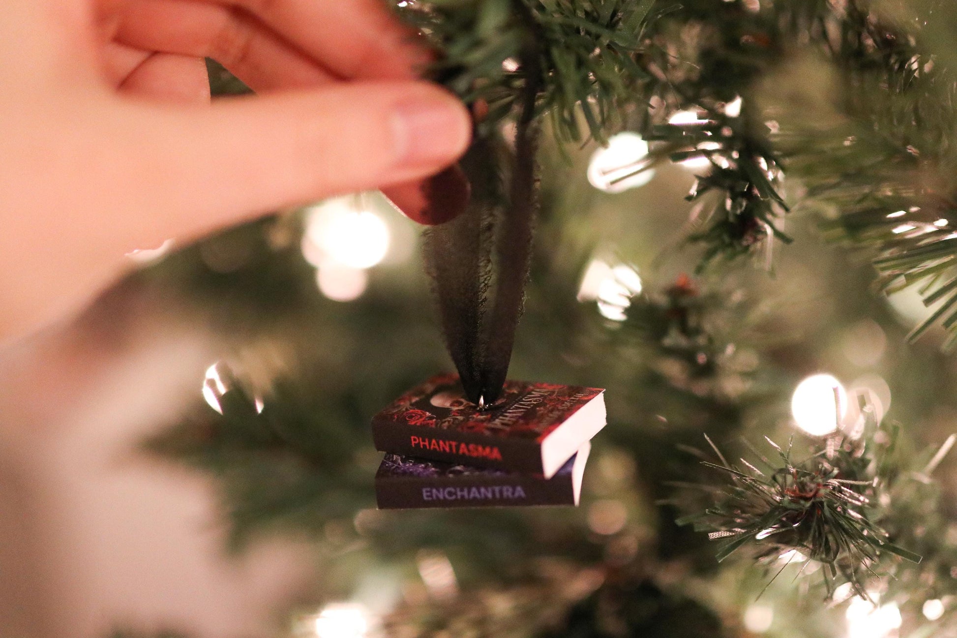 Each ornament includes all of the books from the series, securely glued together in a neat stack to create a realistic mini tower of stories. A small hook is carefully glued to the top of the stack and finished with a high-quality chiffon ribbon tied by hand, ready to hang on your Christmas tree or any display. Each miniature book is printed on matte cardstock and carefully adhered to foam board for sturdiness and dimension.